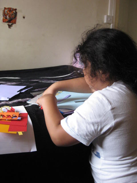Victoria loves flowers. She paints me a rose, a tree of life. One afternoon, with coloured paper strewn all over the bed, she carefully tapes together a mosaic blossom. When it’s finished, she holds it up proudly. I had just read her Mary Oliver’s poem “The Sunflowers”.