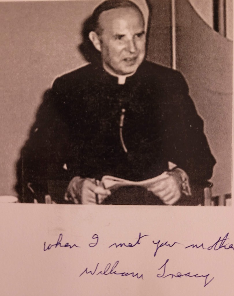 “He had been called, in his words, by ‘spinster sisters’ that my Dad and Mom were renting an apartment from. They had seen her making the sign of the cross, and the next day she was rushed to hospital. Father Treacy was called to visit her.